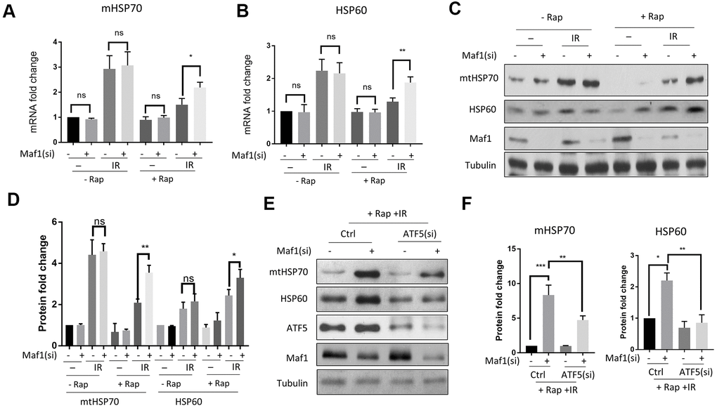 Figure 3. Rapamycin suppresses IR-induced UPRmtthrough Maf1 in A549 cells. (A, B) A549 cells treated with IR and rapamycin were examined for UPRmt marker genes (mHSP70 and HSP60) expression by RT-qPCR. Experiments were performed for 3 biological repeats and data were normalized to non-treated control. (C, D) HSP70 and HSP60 protein levels were analyzed by Western blot. Representative results are shown in (C) and quantification of 3 biological repeats in (D). Data were normalized to non-treated control. (E, F) Maf1 knockdown activated UPRmt in an ATF5-dependent manner. A549 cells were knocked down for Maf1, ATF5 or both, then treated with rapamycin and IR. mHSP70 and HSP60 protein levels were analyzed by Western blot. Representative results are shown in (E). Experiment were performed for 3 times. Data were normalized to non-transfected control. For all bar graph, the error bars stand for Standard Deviation (SD) of the mean. Statistical significance was evaluated by 2-tailed, paired student’s t-test (ns, not significant, *, P<0.05, **, P<0.01, ***, P<0.001).