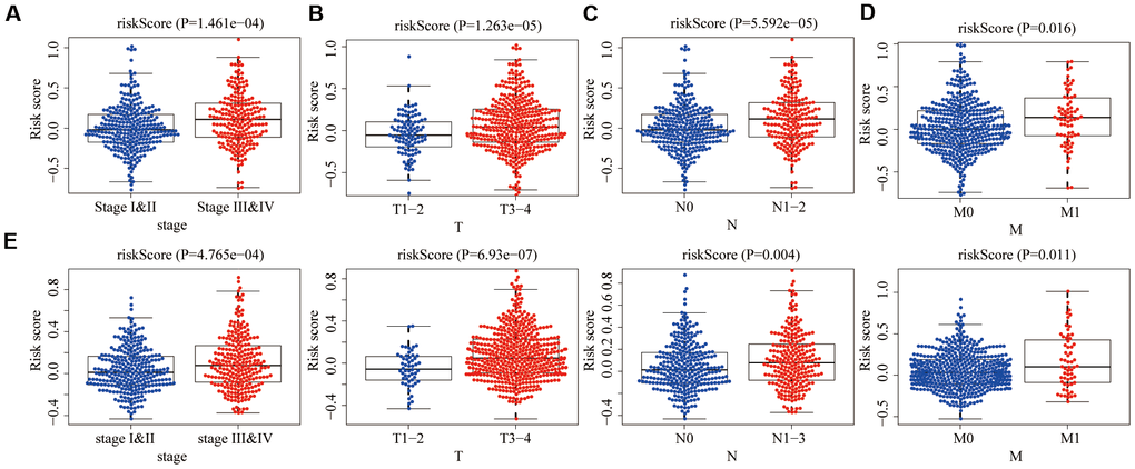 The clinical characteristics of the training and testing group were illustrated in Table 3. To verify our model’s stability and independence in different clinical subgroups, we performed the stratified survival analysis of 1015 CRC patients adjusted to age, gender, stage, T, N and M using the aging-related risk score. All CRC patients in the training and testing group were summarized in the stratified survival analysis. Finally, we concluded that our signature had an excellent prognosis stability. Results of stratified survival analysis were displayed in Figure 6.