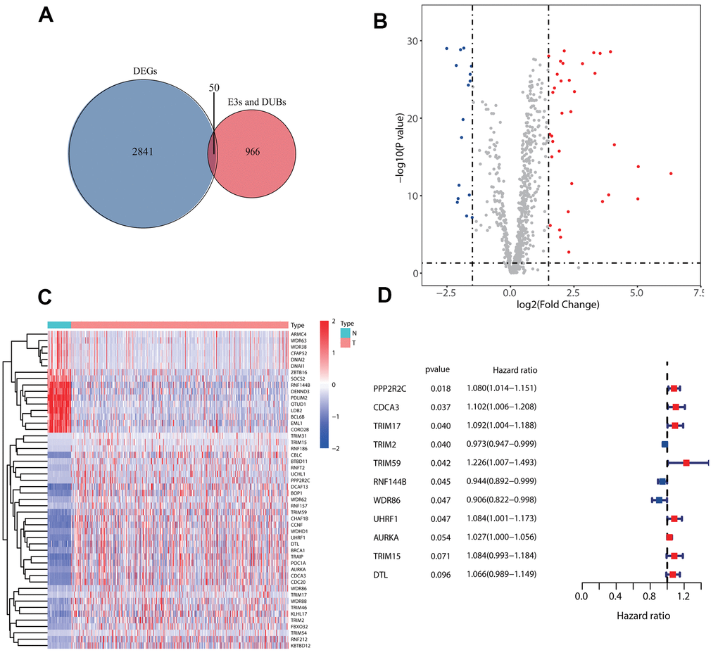 Figure 1. Identification of prognostic E3s/DUBs related DEGs. (A) Veen Diagram for the differentially expressed genes (DEGs)of all samples' whole gene expression with all E3s/DUBs-related genes. (B) Of the 50 E3s/DUBs-related DEGs, 34 were up-regulated, and 16 were downregulated. (C) Heatmap of E3s/DUBs-related DEGs in all samples. (D) Univariate Cox regression analysis showed that 11 genes were associated with overall survival (P<0.1).