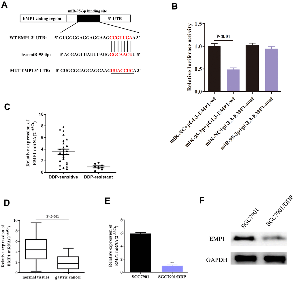 Figure 5. EMP1 and miR-95-3p directly interact. (A) In silico prediction through the miRanda database demonstrated the presence of a binding site of miR-95-3p on EMP1 sequence. (B) Results from dual luciferase activity validate direct interaction between miR-95-3p and EMP1. (C) QRT-PCR results indicate EMP1 is lowly expressed in DDP-resistant GC tissues. (D) QRT-PCR suggests that EMP1 is lowly expressed in GC tissues compared to normal adjacent tissues. (E, F) QRT-PCR and western blot assay suggest that EMP1 is down-regulated in DDP-resistant SGC7901 cell line. **p<0.01 compared to parental SGC7901.