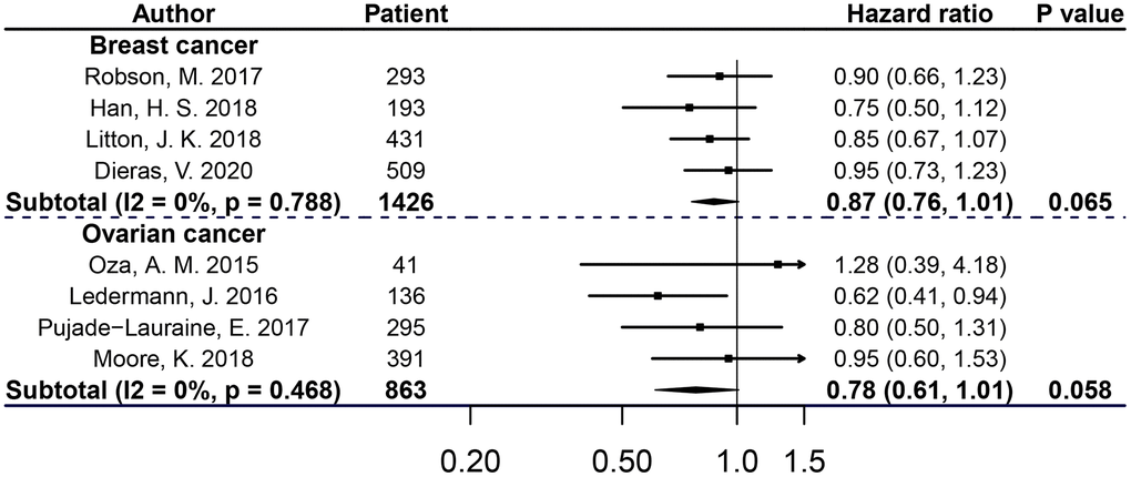 Results: By addition of PARPis to conventional therapy, breast or ovarian cancer patients carrying BRCAm significantly benefited PFS (breast cancer: HR 0.64, 95% CI=0.55-0.75, P<0.001; ovarian cancer: HR 0.33, 95% CI=0.27-0.42, P<0.001), but OS of patients did not increase significantly in these two cancer types (breast cancer: HR 0.87, 95% CI=0.76-1.01, P=0.065; ovarian cancer: HR 0.78, 95% CI=0.61-1.01, P=0.058). For ovarian cancer patients carrying BRCAm, the use of therapy with PARPis yielded longer PFS at the stage of newly diagnosed than the stage of recurrence (22.5 months vs 9.6 months).