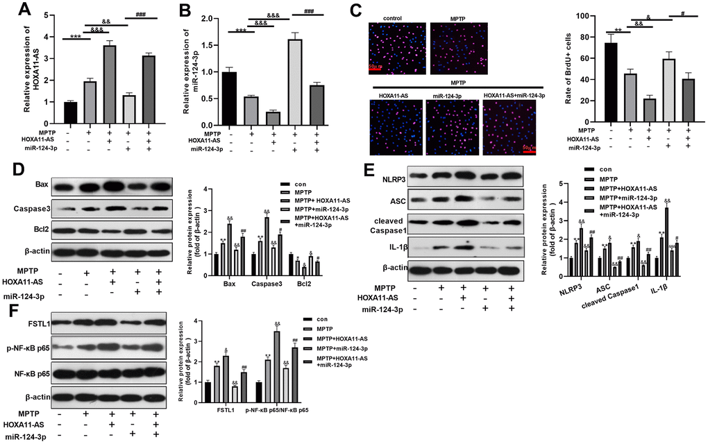 Figure 2. The effect of HOXA11-AS and miR-124-3p on MPTP-mediated SH-SY5Y neuronal damage. An in vitro model of PD was induced by MPTP on SH-SY5Y neuron cells. (A, B) RT-PCR was used to monitor HOXA11-AS and miR-124-3p expressions in SH-SY5Y cells. (C, D) Brdu and Western blot experiments were carried out to test cell viability and expression of apoptosis-related proteins in SH-SY5Y cells. (E, F) Western blot was applied to verify the protein expression of NLRP3 inflammasome, FSTL1 and p-NF-κB in SH-SY5Y cells. ** P <0.01, *** P <0.001 (vs.con group), & P <0.05, && P <0.01, &&& P <0.001 (vs.MPTP group), #P <0.05, ### P <0.001 (vs.MPTP + miR-124-3p group).