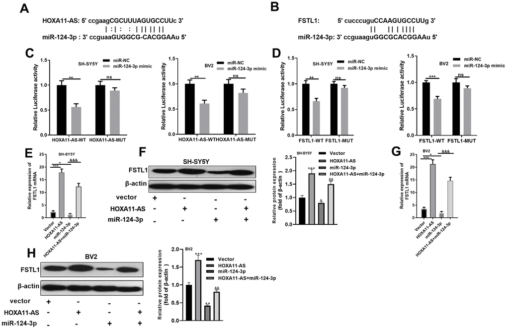 Figure 4. miR-124-3p was the target of HOXA11-AS and FSTL1. (A, B) The targeted association between HOXA11-AS, miR-124-3p and FSTL1 was found in the Starbase database (http://starbase.sysu.edu.cn/). (C, D) Dual-luciferase reporter assay was conducted to verify the targeting relationship between HOXA11-AS and miR-124-3p, miR-124-3p and FSTL1 in SH-SY5Y and BV2 cells. (E–H) RT-PCR and Western blot experiments were adopted to determine FSTL1 mRNA and protein expressions. nsP> 0.05, ** P <0.01, *** P <0.001 (vs.miR-NC group) *P <0.05, *** P <0.001 (vs.vestor group) &&& P <0.001 (vs.miR-124 -3p group).