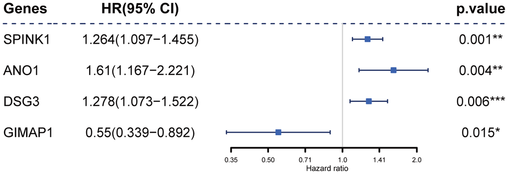 Next, univariate Cox regression analysis was performed to identify potential prognostic RRDEGs in the training group; 51 RRDEGs were identified that were significantly associated with overall survival (Supplementary Table 4). Lasso-penalized Cox analysis was then used to eliminate model over-fitting and showed that the expression of 10 RRDEGs was correlated with overall survival in patients with pancreatic cancer (Supplementary Figure 1A, 1B and Supplementary Table 5). Subsequently, a prognostic signature composed of four genes, including anoctamin 1 (ANO1), desmoglein 3 (DSG3), serine peptidase inhibitor Kazal type 1 (SPINK1) and GTPase, IMAP family member 1 (GIMAP1), was identified using stepwise multivariate Cox regression analysis (Figure 4). The downregulated gene GIMAP1, with a hazard ratio (HR) < 1, was regarded as a tumor suppressor, while the upregulated genes ANO1, DSG3, and SPINK1, with a HR > 1, were considered oncogenes. The risk score was calculated using the following formula: