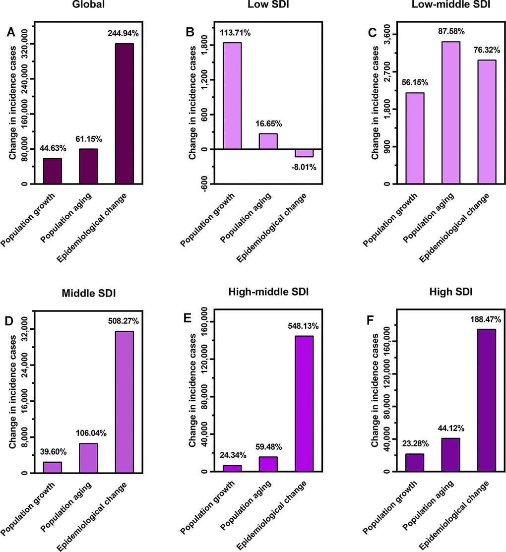 Figure 4. The proportions of CAVD incident cases varied from 1990 to 2019 attributed to population growth, population aging, and epidemiological change in (A) the globe; (B) low SDI quintiles; (C) low-middle SDI quintiles; (D) middle SDI quintiles; (E) high-middle SDI quintiles; and (F) high SDI quintiles. Epidemiological change refers to the CAVD incident cases variation when age structure and population remained constant. CAVD, calcific aortic valve disease; SDI: socio-demographic index.
