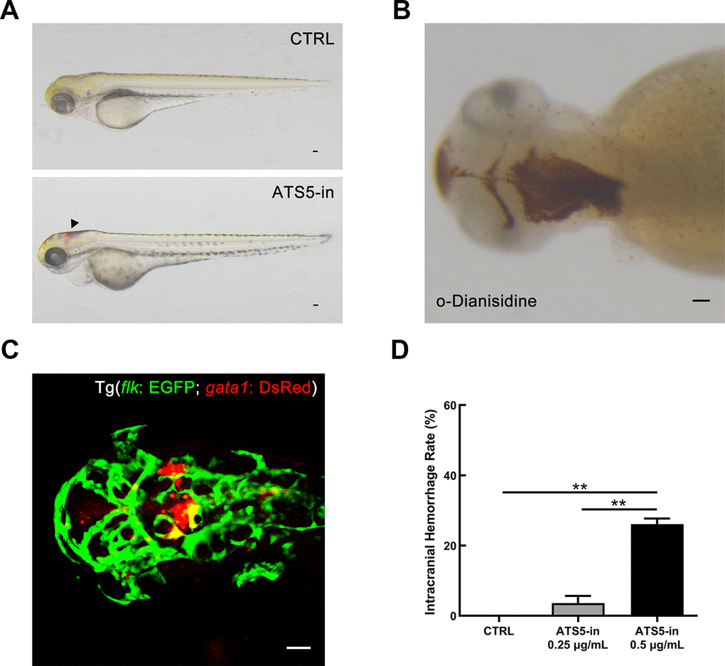 Figure 7. Inhibition of ADAMTS-5 causes intracranial hemorrhage in zebrafish. (A) Zebrafish embryos treated with DMSO (control, CTRL group), and intracranial hemorrhage in embryos treated with 0.5 μg/mL of ADAMTS-5 inhibitor (ATS5-in). The black arrow indicates the bleeding site. (B) O-Dianisidine staining confirming intracranial hemorrhage at 72 hpf. (C) Confocal microscopy showing cerebral blood vessel leakage of the Tg (flk: EGFP; gata1: DsRed) embryo. (D) Incidence rates of intracranial hemorrhage of the control group (CTRL) and ADAMTS-5 inhibitor treatment group (ATS5-in) at 0.25 μg/mL and 0.5 μg/mL. Scale bar: 50 μm. **P<0.01.