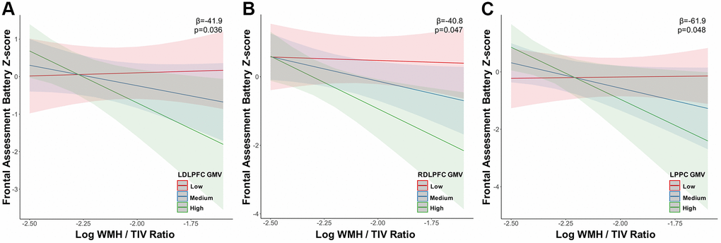 Figure 3. Grey matter volume in the executive control network moderates the relationship between white matter hyperintensity volume and executive function at high white matter hyperintensity load. The association between executive function (frontal assessment battery) decline and increasing WMH load in tercile 3 was moderated primarily by executive control network (A) LDLPFC, (B) RDLPFC and (C) LPPC grey matter volume. Abbreviations: WMH, white matter hyperintensity; TIV, total intracranial volume; LDLPFC, left dorsolateral prefrontal cortex; RDLPFC, right dorsolateral prefrontal cortex; LPPC, left posterior parietal cortex; GMV, grey matter volume.