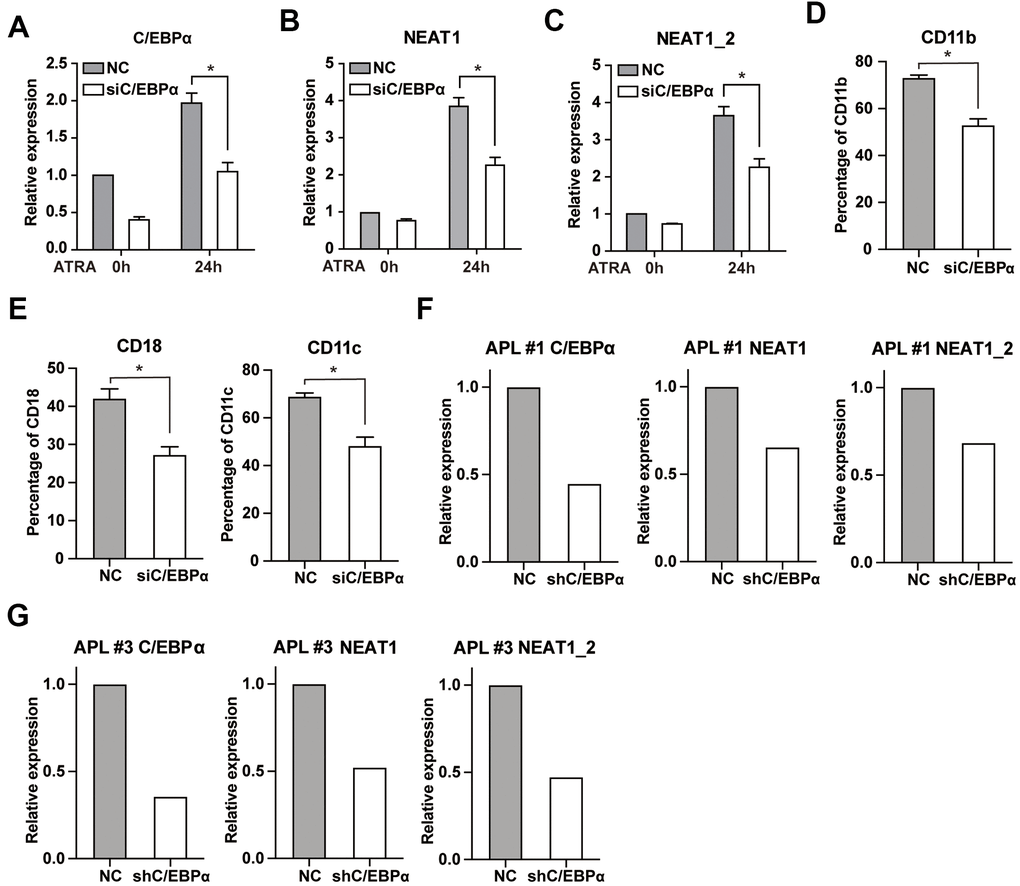 Figure 4. Knockdown of C/EBPα attenuates ATRA-induced upregulation of NEAT1 and NB4 cell differentiation. (A) NB4 cells were transfected with 3 μg siRNA targeting C/EBPα (siC/EBPα) or negative control siRNA (NC). Six hours later, cells were treated with 1μM ATRA for 24 h. Expression of C/EBPα was subsequently determined by qRT-PCR. (B, C) Expression of NEAT1 and NEAT1_2 isoform in C/EBPα-silenced NB4 cells was detected both before and after ATRA treatment. (D, E) The granulocytic differentiation marker CD11b, CD18, and CD11c in C/EBPα-silenced NB4 cells were tested after ATRA treatment for 24 h. The data represent the mean ± S.E.M from three replicates. * indicates p<0.05. (F, G) The expression of NEAT1 and NEAT1_2 isoform in C/EBPα-silenced primary APL bone marrow cells was measured after ATRA treatment for 24 h.