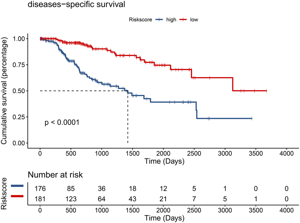 Figure 8. Hepatocellular carcinoma patients from the TCGA cohort in the low-risk group had better disease-specific survival (DSS) (P < 0.001).
