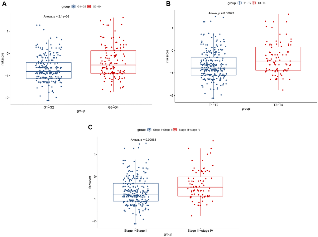 Figure 9. Significant differences of risk score were found between: (A) different tumor grades; (B) different T stages; and (C) different AJCC stages.
