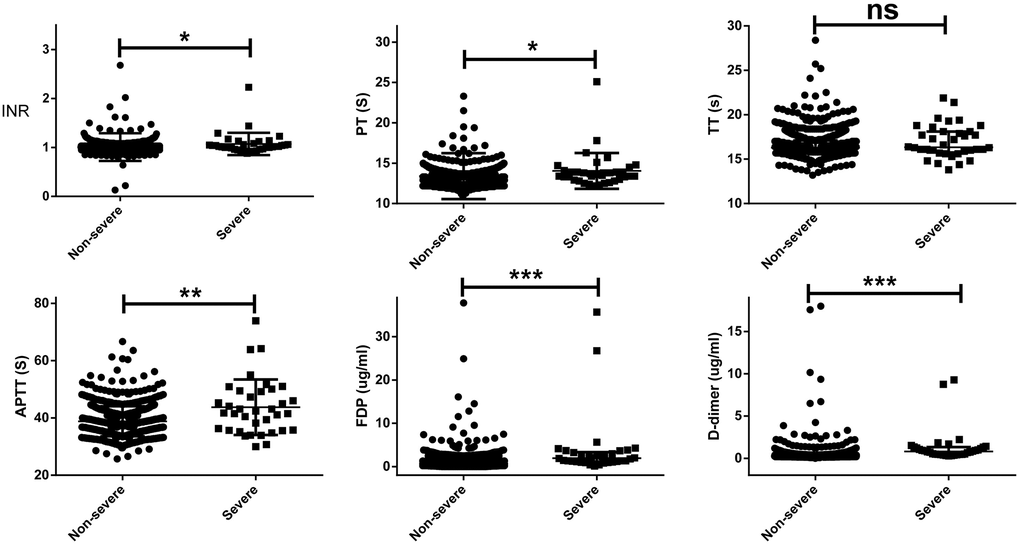 Figure 1. A scatter plots of the coagulation values on hospital admission between severe and non-severe patients. The severe patients had a slightly higher INR (1.02 vs 0.99, p = 0.016), PT (13.6s vs 13.2s, p = 0.019), APTT (42.1s vs 38.4s, p = 0.019), whereas remarkably higher FDP (2.03 vs 0.65 ug/ml, p < 0.001) and D-dimer (0.87 vs 0.27 ug/ml, p < 0.001) than non-severe patients.