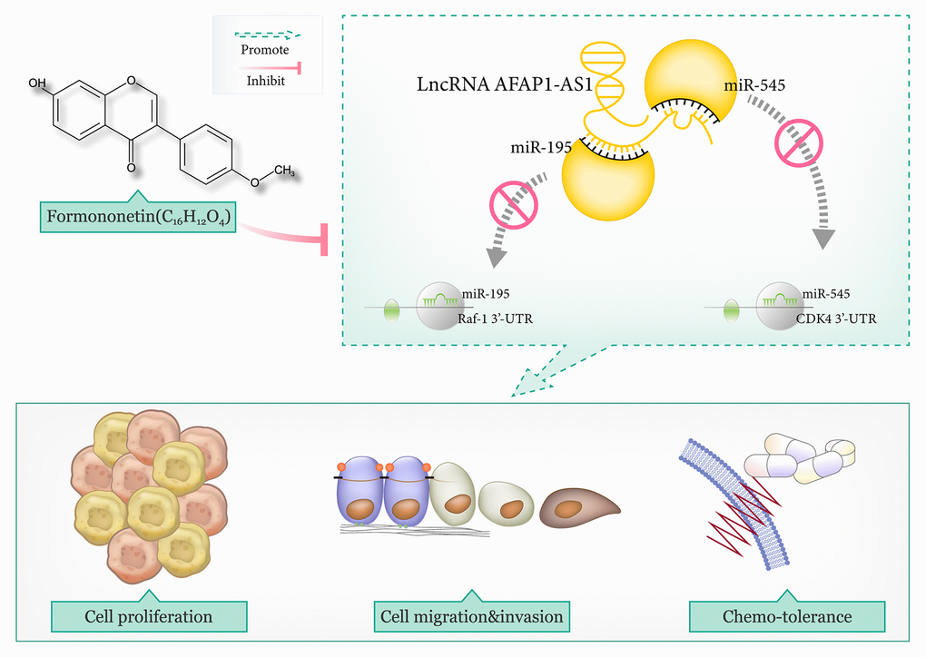 To bridge this gap, this investigation was designed to unveil lncRNAs (e.g. lncRNA AFAP1-AS1) and associated miRNA networks that were involved in the protective impact of formononetin against TNBC development, which might be conducive to clinical treatment of TNBC.