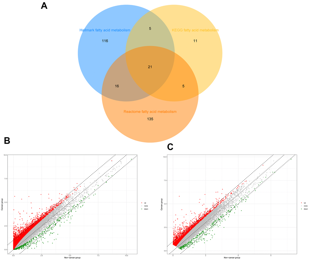 Figure 1. Identification of differential expressed fatty acid metabolic genes in HCC. (A) Venn diagram of three fatty acid metabolic gene sets. (B) Differential expressed genes of HCC patients in TCGA. (C) Differential expressed genes of HCC patients in ICGC.
