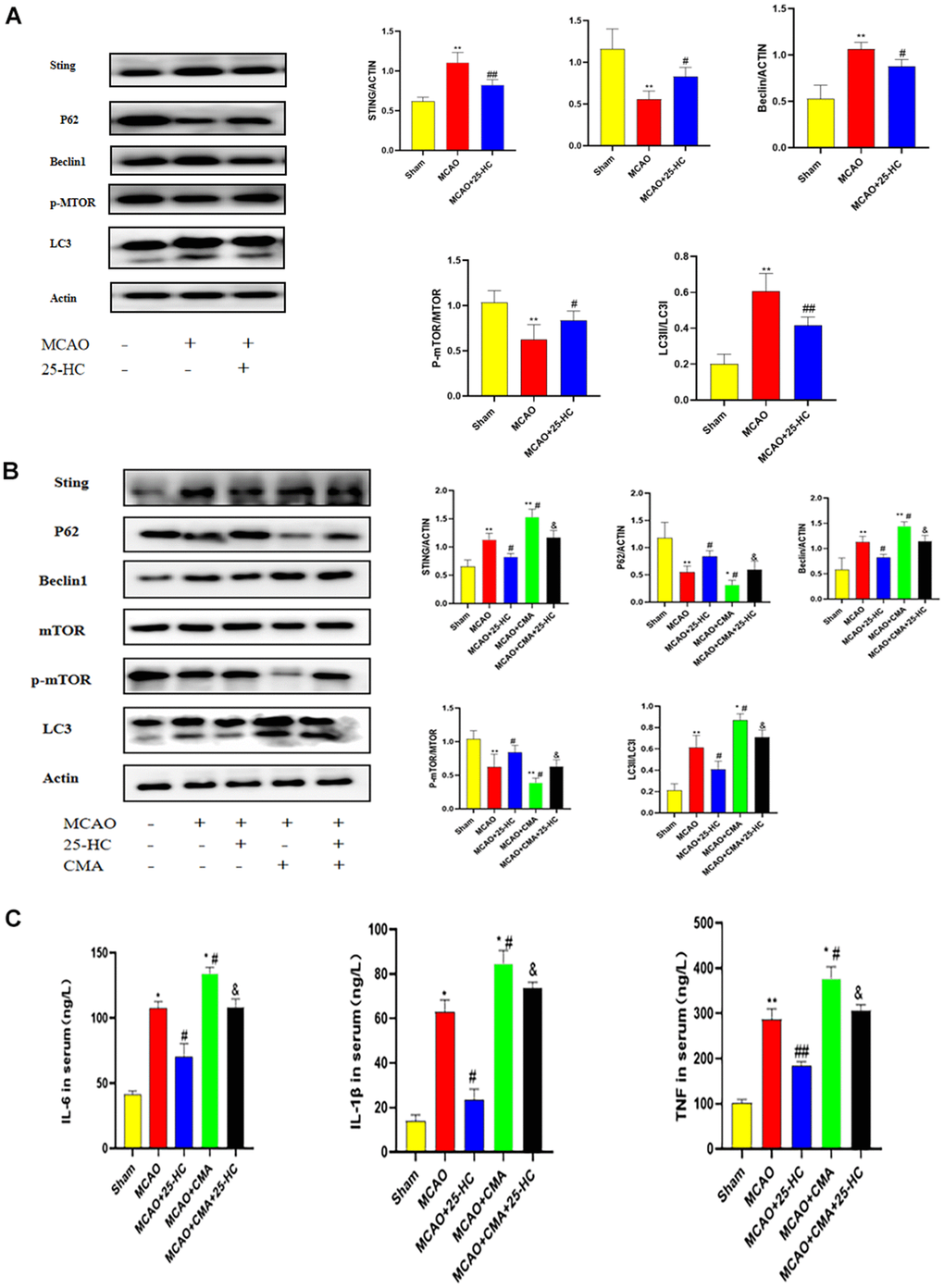Figure 3. 25-Hydroxycholesterol (25-HC) suppressed the middle cerebral artery occlusion (MCAO)-induced enhanced autophagy, and the effects of 25-HC on autophagy, oxidative injury, apoptosis, and inflammation were reversed by oxygen-10-acridine acetic acid (CMA). (A) Expression of p-mTOR, STING, P62, Beclin1, LC3 I, and LC3 II were tested by Western blot (N = 5 per group, **P<0.001 versus sham group, ##P<0.001, #P<0.05 versus MCAO group). (B) Expression of p-mTOR, STING, P62, Beclin1, LC3 I, and LC3 II were tested by Western blot (N = 5-6 per group, **P<0.01, ***P<0.001, *P<0.05 versus sham group, versus MCAO group). (C) Levels of interleukin (IL)-6, tumor necrosis factor-α, and IL-1β were measured by commercially available ELISA kits (N = 6 per group, **P<0.01 versus sham group, ##P<0.01, #P<0.05 versus MCAO group, P<0.05 versus MCAO+CMA group).
