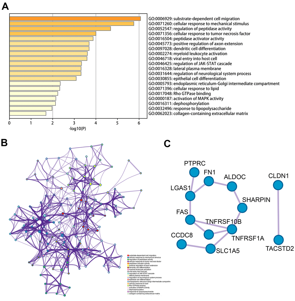 Figure 2. Functional analysis of 62 MDGs based on the metascape. (A) Bar graph of enriched terms across input gene lists, colored by p-values. (B) The network of enriched terms colored by cluster-ID, where nodes that the same cluster-ID are typically close to each other. (C) Protein-protein interaction network identified in the MDGs.