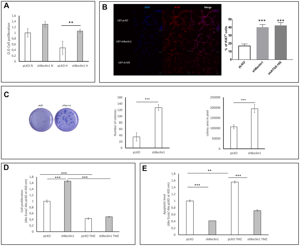 Figure 4. Impact of Beclin1 extinction on glioma cell proliferation and clonogenicity. (A) Cell proliferation in normoxic (N) and hypoxic (H) conditions. Cell proliferation was analyzed using BrdU incorporation (N=3). A slight increase in proliferation rate of U87hBeclin1 cells was observed, as compared with U87pLKO in normoxia; in hypoxic conditions a more significant difference was recorded **p<0.01. (B) Ki67 expression significantly increases in shBeclin1 and shATG5 cells compared to pLKO condition ***p<0,001 (C) Colony forming unit assay with U87shBeclin1. The clonogenic assay was performed as described in material and methods (N=3). There is a significant increase in number (left panel) and size (right panel) of U87shBeclin1 colonies as compared with those obtained with U87pLKO *** p<0.001. (D) Impact of TMZ on cell proliferation. In basal condition, after 144 h of cell culture and 3 h of BrdU incorporation, U87shBeclin1 cells proliferate more than U87pLKO (***p<0.001). TMZ treatment at 1.5 mM induces a very significant decrease in cell proliferation of the two cell lines (*** p<0.001) compared to non-treated cells. There was no difference in proliferative rates between U87pLKO and U87shBeclin1 cells when treated with TMZ (N=3). (E) Impact of TMZ on apoptosis. Apoptotic cell death was evaluated using the Elisa Cell death kit as described in material and methods. After 144 h of culture in basal condition, U87pLKO appears to be the most sensitive cell line to basal apoptosis compared to U87shBeclin1 (***p<0.001). TMZ treatment induces a significant increase in cell apoptosis of U87pLKO cell line (**p<0.01) whereas U87shBeclin1 cells appear to be resistant to TMZ-induced apoptosis (N=3).