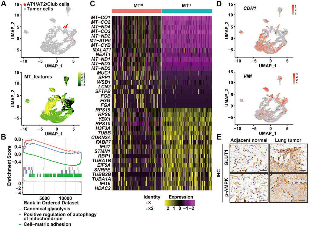 Figure 2. High autophagic cancer cells exhibited low MT-gene signature. (A) After removing the immune, endothelial and fibroblast cells, and re-clustering the remaining cells, predicted normal epithelial cell types, including AT1 (alveolar type I) cells, AT2 (alveolar type II) cells and club cells, based on gene expression were labeled (upper panel), and visualization of MT-gene signature scores (MT-ATP8, MT-ATP6, MT-CO1, MT-CO2, MT-CO3, MY-CYB, MT-ND1, MT-ND2, MT-ND3, MT-ND4, MT-ND4L, MT-ND5, MT-ND6) of malignant cells in 6 primary LUADs (lower panel). (B) GSEA analysis was performed to further screen the significant pathway between MTlo and MThi cancer cells. (C) Heatmap showing the expression level of the top 20 differentially expressed genes for MTlo and MThi clusters. (D) UMAP visualization of CDH1 and VIM of malignant cells in 6 primary LUADs. (E) IHC staining of phosphorylated AMPK (p-AMPK) and GLUT1 in tumor-adjacent tissue and LUSC tissue. Dashed line, tumor-stroma border. Scale bars, 50 μm.