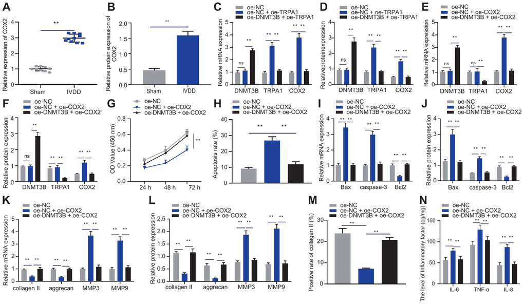 Figure 5. DNMT3B regulated NP cell proliferation and ECM degradation by inhibiting TRPA1-COX2 axis. (A) The expression of COX2 in the intervertebral disc tissue of IVDD and Sham rats was detected by RT-qPCR (n = 10). (B) Western blot showing the expression of COX2 in the intervertebral disc tissue of IVDD and Sham rats. (C) mRNA expression of DNMT3B, TRPA1, and COX2 in NP cells after 24 hours of treatment with oe-DNMT3B and oe-TRPA1 was detected by qRT-PCR. (D) Protein expression of DNMT3B, TRPA1, and COX2 in NP cells after 48 hours of treatment with oe-DNMT3B, oe-TRPA1 or oe-NC was detected by Western blot. (E) DNMT3B, TRPA1, and COX2 mRNA expression in NP cells after 24 hours of treatment with oe-DNMT3B, oe-COX2 or oe-NC detected by RT-qPCR. (F) DNMT3B, TRPA1, and COX2 protein expression in NP cells after 48 hours of treatment with oe-DNMT3B, oe-COX2 or oe-NC detected by Western blot. (G) The proliferation of NP cells after 24 hours of treatment with oe-DNMT3B, oe-COX2 or oe-NC was detected by CCK-8 assay. (H) The apoptosis of NP cells after 48 hours of treatment with oe-DNMT3B or oe-COX2 was detected by flow cytometry. (I) The expression of apoptosis-related factors Bax, Bcl-2, and caspase-3 was detected by qRT-PCR in NP cells after 24 hours of treatment with oe-DNMT3B or oe-COX2. (J) The expression of apoptosis-related factors Bax, Bcl-2, and caspase-3 was detected by Western blot in NP cells after 48 hours of treatment with oe-DNMT3B or oe-COX2. (K) The expression of collagen II, aggrecan, MMP3, and MMP9 was detected by qRT-PCR in NP cells after 24 hours of treatment with oe-DNMT3B or oe-COX2. (L) The expression of collagen II, aggrecan, MMP3, and MMP9 was detected by Western blot in NP cells after 48 hours of treatment with oe-DNMT3B or oe-COX2. (M) Immunofluorescence staining showing collagen II protein in NP cells after 48 hours of treatment with oe-DNMT3B or oe-COX2. (N) Inflammatory factors IL-6, TNF-α, IL-8 levels in NP cells after 24 hours of treatment with oe-DNMT3B or oe-COX2 were detected by ELISA. Measurement data are expressed as the mean ± standard deviation (n = 3) and analyzed using independent sample t-tests between two groups, using one-way ANOVA between multiple groups, or using two-way ANOVA between groups at different time points. **, p < 0.01.