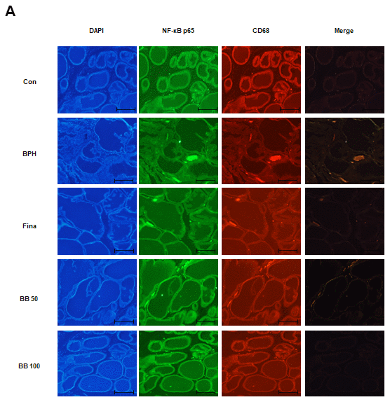 Figure 5. Effect of BB on expression patterns of NF-κB p65 and CD68 in testosterone-induced BPH rat model. (A) Fluorescent intensity and co-localization of NF-κB p65 and CD68+ cells in prostate sections from BPH rats. Whole-mount immunohistochemistry of the nucleus (blue), NF-κB p65 (green), and CD68 (red). The overlays show the extent of co-localization (yellow) of NF-κB p65 with macrophage marker CD68. Original magnification 100×.