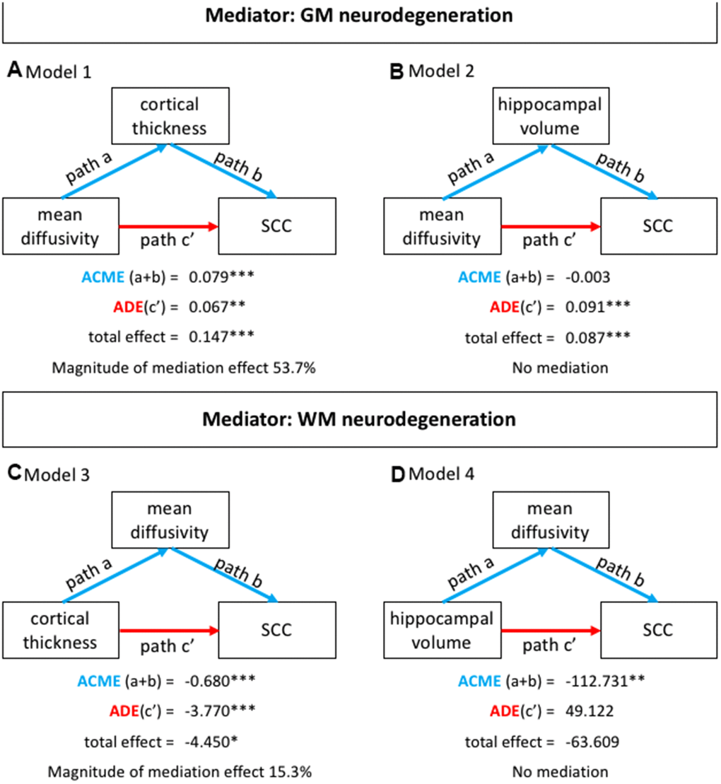 The only previous study investigating the association between GM neurodegeneration and WM neurodegeneration in SCD used partial correlation analyses [23]. However, correlation analyses are limited when it comes to fully understand the way in how GM and WM neurodegeneration have an effect on each other and their joint contribution towards subjective cognitive complaints. A strength of our study is that we extended that approach by using mediation analysis. The advantage of mediation analysis is the possibility to ascertain the unique and combined contribution of GM and WM neurodegeneration towards complaints. Further, by testing complementary models it can be studied whether one of the neurodegeneration markers is the main driver of the contribution towards complaints. We specifically tested: (i) whether GM neurodegeneration mediates the association between WM neurodegeneration and subjective cognitive complaints; and (ii) whether WM neurodegeneration mediates the association between GM neurodegeneration and subjective cognitive complaints. Mediation analysis were conducted using the “Mediation” R package [67]. The TIV-corrected hippocampal volume (left+right), and the average cortical thickness and average MD of statistically significant clusters (see above) were used as the input data for mediation analysis. All mediation models are represented in Figure 1. In order to investigate the role of age in our analyses, the four mediation models were fitted with and without age as a covariate.