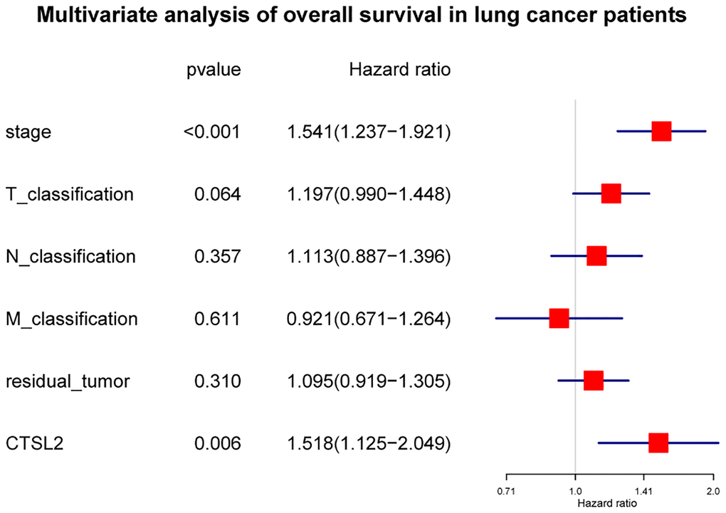 Public TCGA (The Cancer Genome Atlas) database was analyzed for data mining with no ethical concern, involving 517 LUAD patients. The RNA expression of CTSL2 was box-plotted. ROC (Receiver operating characteristic) curve was drawn with the AUC (area under curves) calculated using pROC package [44]. The high-expressed and low-expressed groups were determined by identified CTSL2 threshold level. The survival package in R and Cox model was used as previously reported [45]. The covariates included in the multivariate Cox regression model were stage, T, N, M classification, residual tumor, and CTSL2 expression. GSE30219 (analyzing 293 lung tumor and 14 normal lung specimen) and GSE50081 (analyzing 181 Stage I and II non-small cell lung carcinoma) were used for external validation. Evaluation of subgroups was performed as well. GSEA was carried out for identification of CTSL2 expression-related genes and examination of the survival significances. Oncomine database and TIMER database were used for validation of CTSL2 expression.