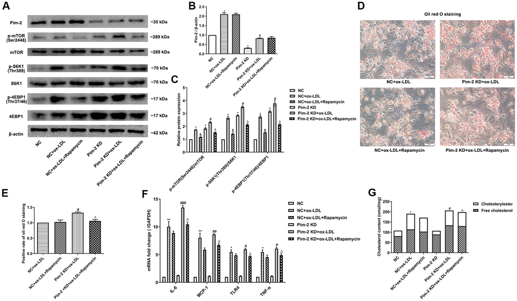 Figure 7. mTOR inhibitor treatment rescues the proinflammatory effect of Pim-2 KD in THP-1-derived macrophages. (A) Representative western blot analysis of Pim-2, p-mTOR (Ser2448) and mTOR, p-S6K1 (Thr389) and S6K1, and p-4EBP1 (Thr37/46) and 4EBP1 in rapamycin-exposed ox-LDL-treated THP-1-derived macrophages after Pim-2 KD. β-Actin was used as a loading control. (B, C) Corresponding densitometric analysis of blots in (A). (D) Intracellular lipid droplets were stained with oil red O working solution in rapamycin-disposed ox-LDL-treated THP-1-derived macrophages after Pim-2 KD. (E) Quantification of positive staining for lipid droplets (n=3 per group). (F) mRNA expression of inflammatory cytokines, including IL-6, MCP-1, TLR-4 and TNF-α, was determined by quantitative RT-PCR in rapamycin-treated ox-LDL-treated THP-1-derived macrophages after Pim-2 KD; the values were normalized to the housekeeping gene GAPDH. (G) The concentrations of TC, FC, and CE were determined using the TC/FC Quantification Assay (n=3 per group). The data are represented as the means ± SD of three independent experiments; *P < 0.05, **P < 0.01 versus the NC group; &P < 0.05 versus the ox-LDL-treated NC group; #P < 0.05, ##P < 0.01, ###P < 0.001 versus the Pim-2 KD group; ΔP < 0.05 versus the Pim-2 KD group.