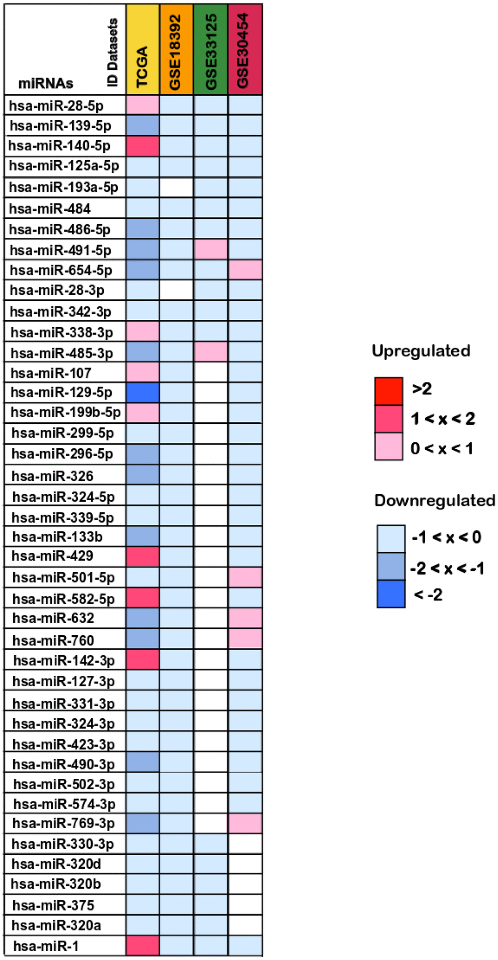 Figure 3. Differentially expressed miRNAs between colorectal cancer and normal tissue samples. The log2(FC) values calculated for each dataset are reported with red scale boxes for upregulated miRNAs and blue scale boxes for the downregulated miRNAs. White boxes represent the inexistence of the miRNA on the dataset. Only the miRNAs differentially expressed in at least 2 datasets while simultaneously being present in the TCGA dataset are displayed.