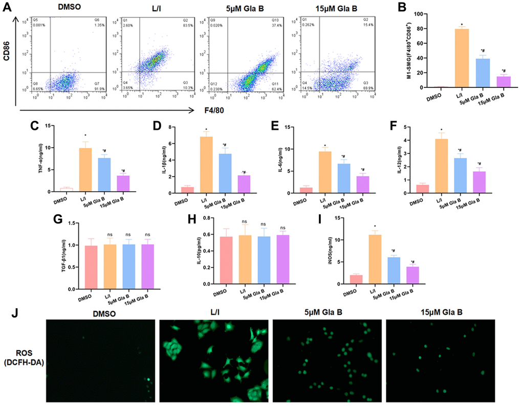 Figure 1. The effect of Gla B on SMG M1 polarization. (A–B) Detection of the ratio of F4/80+CD86+ M1 type cells by flow cytometry. LPS/IFN-γ could promote SMG M1 type polarization. Gla B could inhibit polarization and decrease the ratio of F4/80+CD86+ cells. Comparison with DMSO, *P < 0.05; comparison with L/I, #P < 0.05. (C–F) and (I) Detection of M1 type cell marker. After LPS and IFN-γ treatment to induce M1 polarization, the levels of TNF-α, IL-1β, IL-6, iNOS and IL-12 were significantly up-regulated, and Gla B could inhibit the up-regulation of cytokines. Comparison with DMSO, *P < 0.05; comparison with L/I, #P < 0.05. (G–H) Detection of M2 type cell marker. After LPS and IFN-γ treatment to induce M1 polarization, the expression of TGF-β1 and IL-10 was not significantly changed, while Gla B also had no effect on the expression of TGF-β1 and IL-10. nsP < 0.05. (J) Detection of ROS by DCFH-DA. After LPS and IFN-γ treatment to induce M1 polarization, the expression of ROS was significantly up-regulated while Gla B inhibited the expression of ROS.