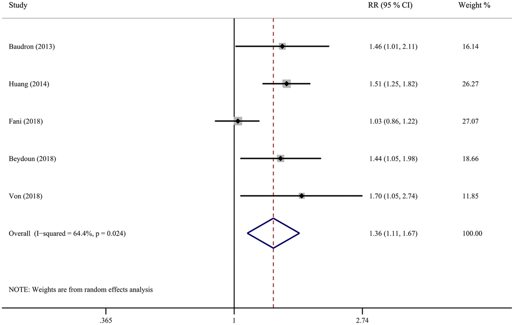 Five cohort studies investigated the correlation between H. pylori infection and all-cause dementia, including two retrospective and three prospective. Figure 2 shows the results of pooled RR with a random-effects model. Four studies demonstrated a significant positive association and the RR for the association ranged from 1.03 to 1.70. Overall, the pooled results indicated that H. pylori infection participants had a considerably risk of developing all-cause dementia compared to those negative for H. pylori (RR = 1.36; 95% CI = 1.11 - 1.67), with significant heterogeneity (I2 = 64.4%, P = 0.024). Sensitivity analysis was assessed by removing each study in sequence and re-analysing the data shows that the study of Fani et al. has an impact on the results (Supplementary Figure 1). Interestingly, the heterogeneity decreased to 0% after excluding this study, while the effect estimates increased (RR = 1.50; 95% CI = 1.31-1.73) (Supplementary Figure 2).