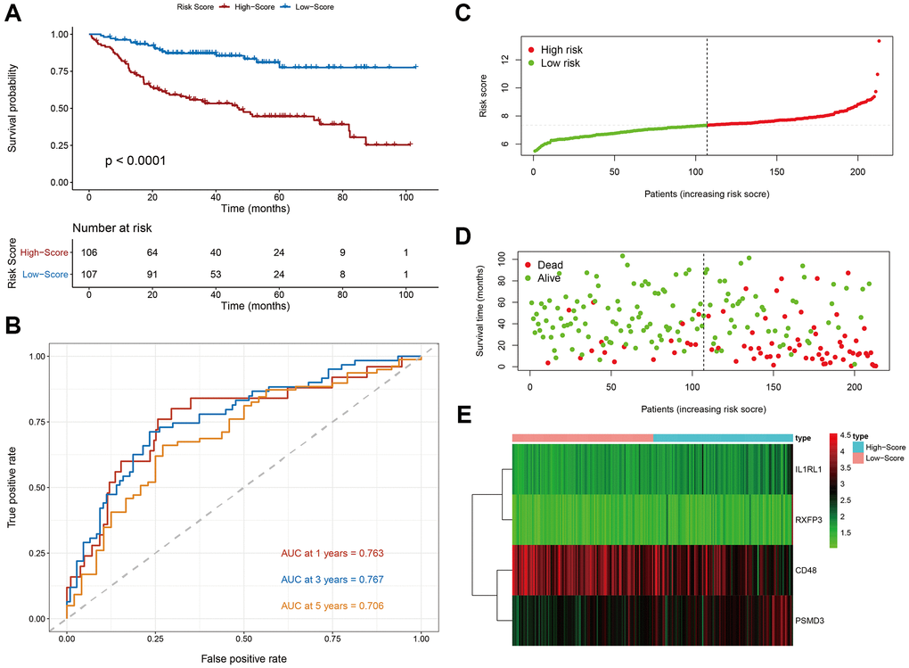 Figure 2. Evaluation of the prognostic signature in the discovery cohort. (A) Kaplan-Meier plots of overall survival between high- and low-risk patients. (B) Time-dependent receiver operating characteristic (ROC) curve analysis. (C) The risk score distribution. (D) The survival status distribution. (E) Expression heatmap of the four immune-related risk genes.