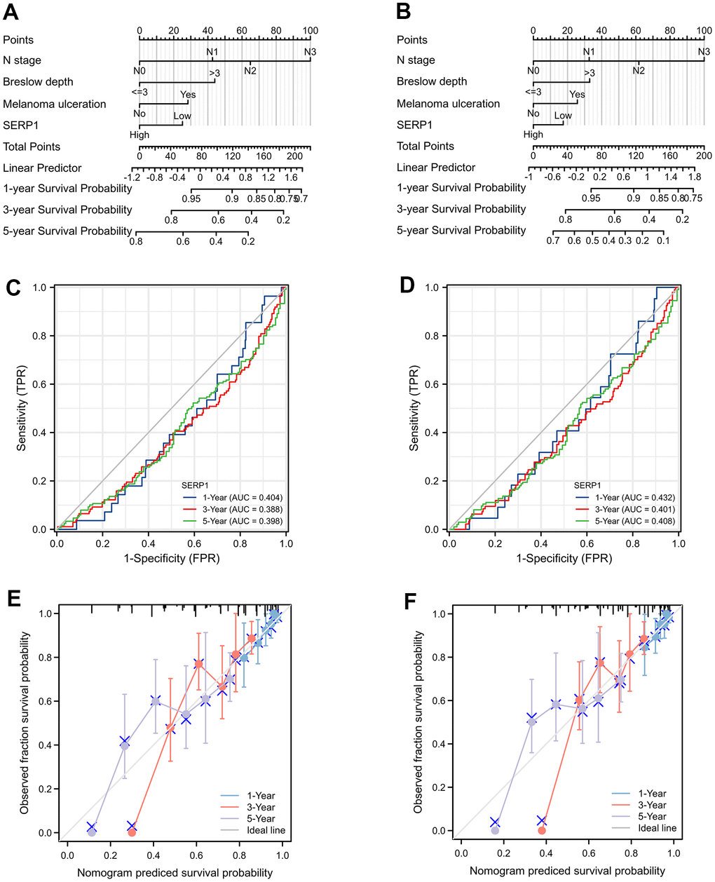 The nomograms predicting OS (Figure 8A) and DSS (Figure 8B) was constructed based on significant risk factors identified from in the univariate Cox analyses. The score of the corresponding risk factors should be first identified by the point scale at the top of the nomogram. All scores were then summed and the corresponding 1-year, 3-year, and 5-year survival probability was obtained corresponding to the scales at the bottom of the nomogram. The time-dependent ROC curves of OS and DSS are shown in Figure 8C, 8D, respectively. The 1, 3, and 5-year AUCs of OS are 0.404 (95% CI 0.308-0.500), 0.388 (95% CI 0.324-0.453) and 0.398 (95% CI 0.334-0.463), respectively. The 1, 3, and 5-year AUCs of DSS are 0.432 (95% CI 0.324-0.539), 0.401 (95% CI 0.333-0.469) and 0.408 (95% CI 0.341-0.475), respectively. These suggesting that low SERP1 has a good predictive efficacy and diagnostic accuracy for survival of SKCM patients. Details of the ROC information are presented in Supplementary Table 10.