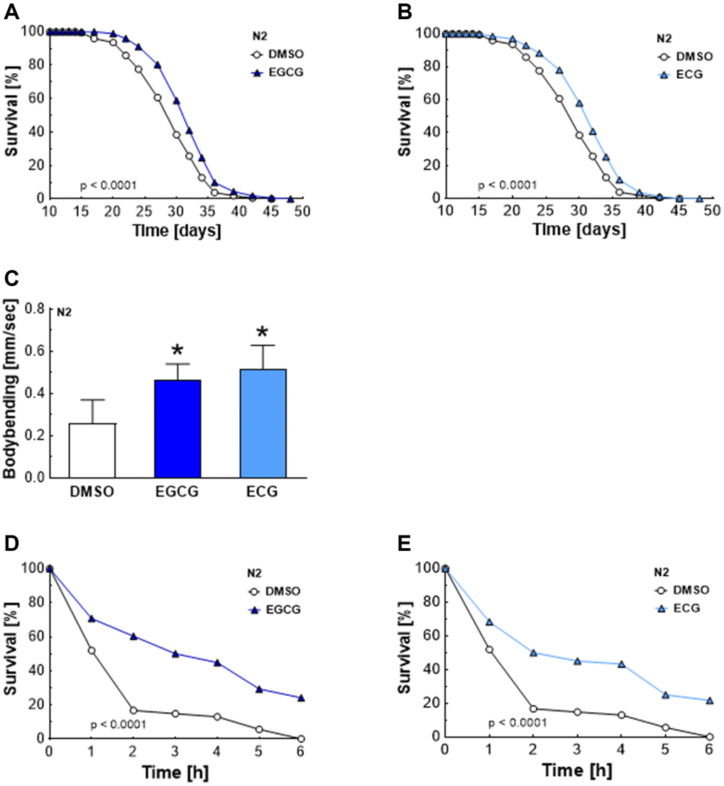 Figure 1. Increased lifespan, locomotion activity, and stress resistance after EGCG and ECG treatment. The representative outcome of lifespan assay of N2 wild-type nematodes in the presence of 2.5 μM EGCG versus DMSO. (A) The representative outcome of lifespan assay of N2 wild-type nematodes in the presence of 2.5 μM ECG versus control. (B) Locomotion quantification for N2 wild-type nematodes after 7 days exposure to DMSO, 2.5 μM EGCG, or 2.5 μM ECG. (C) The representative outcome of the survival analysis (h) of N2 nematodes in 50 mM paraquat solution after 7 days of pretreatment with EGCG (D) or ECG (E) in comparison to worms pretreated with DMSO. P-values are as indicated in the graphs. See Table 1 and Table 2 for corresponding detailed data and statistical analyses of lifespan assays and of paraquat stress assay, respectively.