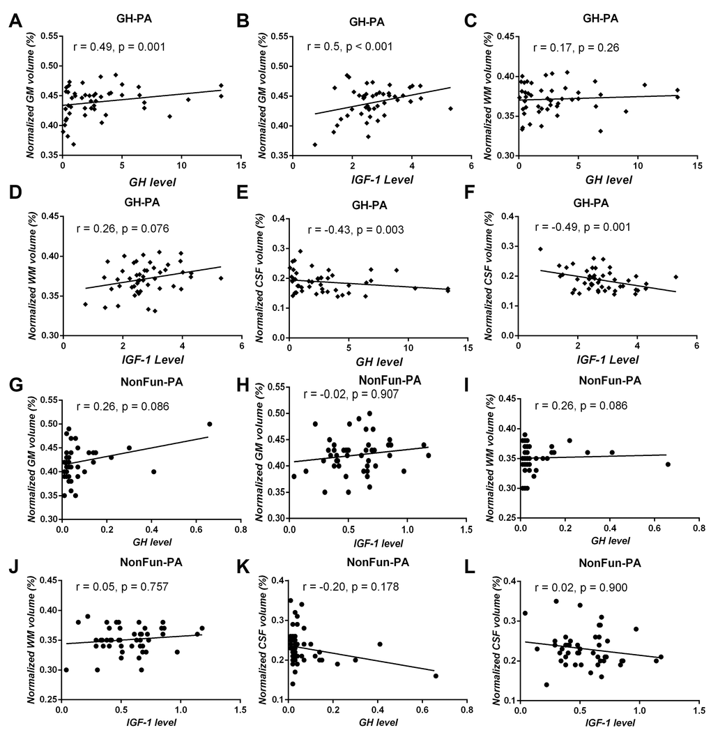 Figure 2. Correlation analysis between serum GH/IGF-1 levels and brain tissue volume in patients with GH-PA and patients with NonFun-PA groups. The normalized GM volume (nGMV) shows significant positive correlation with GH (A) and IGF-1 (B) in patients with GH-PA. The normalized WM volume (nGWV) shows no significant correlation with GH (C) or IGF-1 (D) in patients with GH-PA. The normalized CSF volume (nCSFV) shows significant negative correlation with GH (E) and IGF-1 (F) in patients with GH-PA. In patients with NonFun-PA, nGMV, nWMV, and nCSFV show no significant correlation with GH/IGF-1 (G–L).