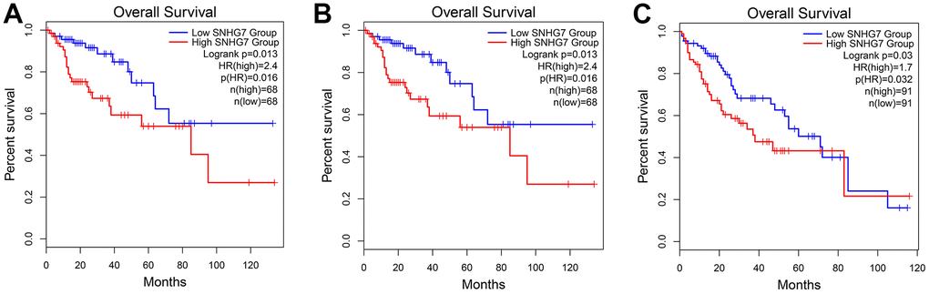 Figure 8. Validation of the prognostic value of SNHG7 based on the TCGA database. (A) The survival curve of patients with COAD; (B) The survival curve of patients with BLCA; (C) the survival curve of patients with LIHC. Abbreviations: COAD, colon adenocarcinoma; BLCA, bladder urothelial carcinoma; LIHC, liver hepatocellular carcinoma; TCGA, The Cancer Genome Atlas.