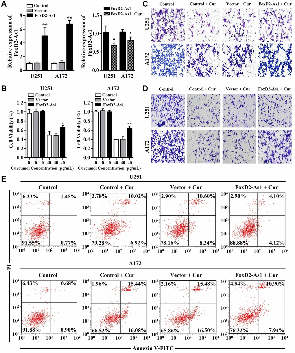 Figure 5. Over-expression of FoxD2-As1 reduced the anti-proliferation, anti-metastasis, and pro-apoptosis effects of curcumol in glioma cells. (A) qRT-PCR was performed to determine FOXD2-As1 expression in glioma cells of each group. pcDNA3.1-FOXD2-As1 transfection markedly increased the expression of FOXD2-As1 in glioma cells while the upregulated FOXD2-As1 expression was inhibited by curcumol treatment. (B) MTT assay was performed to determine the viability of each group cells after treated with curcumol for 48 h. (C) Transwell migration and (D) invasion assays were performed to examine the metastasis of each group cells after treated with curcumol for 48 h. (E) Annexin V-FITC/PI apoptosis assay was performed to examine the apoptotic rate of each group cells after treated with curcumol for 48 h. Data were represented as means ± SD from at least of three independent experiments. *p < 0.05, **p < 0.01.