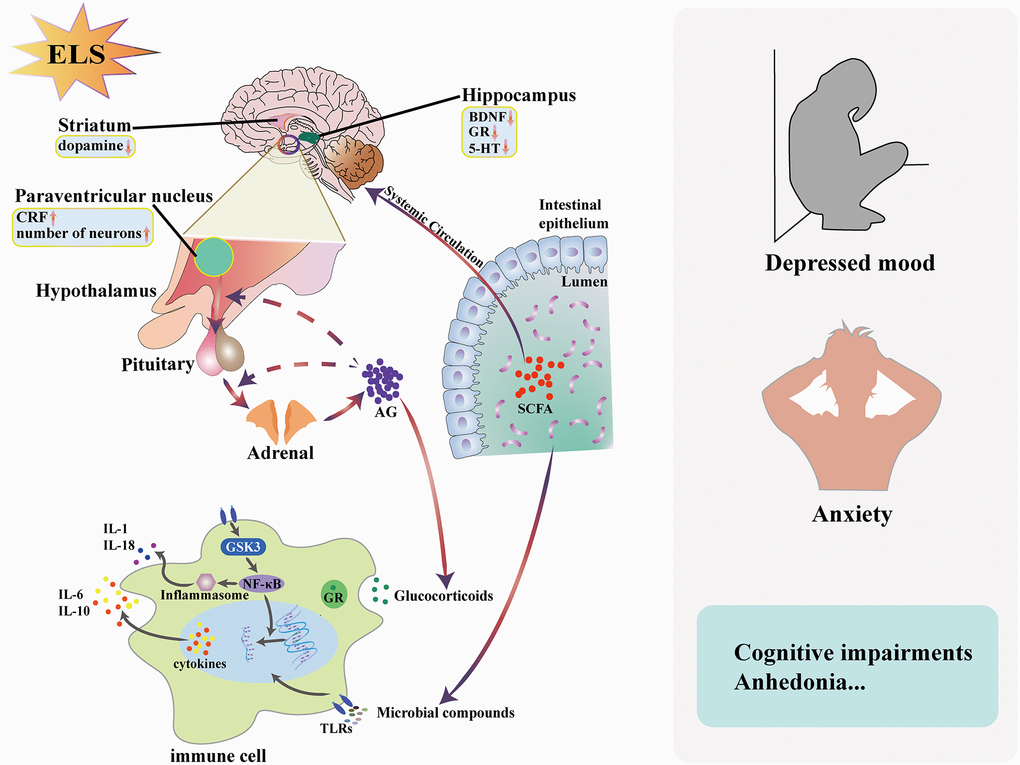 Clinical studies have found that early life stress is strongly associated with the development of depression in adulthood [1–4]. Individuals that have experienced early life stress have a significantly higher risk of depression, mania, schizophrenia and other psychiatric disorders in adulthood than those have not experienced early life stress [5]. Early life stress is significantly more associated with the onset of depression than recent stressful events with depression [6]. In addition, patients with depression who experienced a stressful event in childhood showed clinical features such as earlier age of onset, more severe depressive symptoms, more prolonged course, recurrent episodes and significantly reduced efficacy of common antidepressants [7]. Basic research has also shown that early environmental stress induces depression in rodents and primates in adulthood [8]. However, the pathways or mechanisms through which stressful events occurring early in life contribute to the onset of depression are not yet entirely clear. Changes in the HPA axis are thought to be key factors in depression susceptibility [9]. For example, MS can produce significant stress. Long-term exposure to stress will lead to the HPA axis hyperactivity in response to stress, which manifests itself in adulthood and persists. In addition, MS increases susceptibility to depression by altering both serotonin and dopamine secretion in relevant areas of the brain. Besides the endocrine system, MS is also closely linked to the immune system. Inflammatory mechanisms are involved in enhancing the stress response after early life stress and in the development of vulnerability to depression [10, 11]. Not only that, recent studies have found that the altered gut microbiota caused by MS may also play an important role. Alterations in composition have been found in MS models and rat models of depression. Even fecal transplants from Major Depressive Disorder (MDD) patients affected depression-like behavior in recipient animals [12]. As shown in Figure 1, we demonstrated the association between early-life stress and depression from the perspective of neuroendocrinology, immune and gut microbiota.