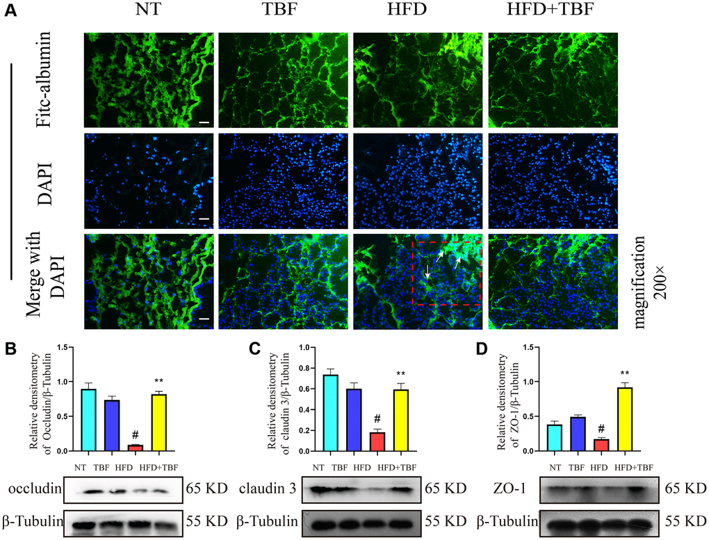 Figure 5. The effect of TBF on the blood-milk barrier induced by HFD during pregnancy and lactation. Fresh mice mammary tissue was immersed in 2 mg/mL FITC for 15 min, then the mammary tissue block was placed in liquid nitrogen, and finally the tissue block was frozen sectioned by a cryostat. After DAPI staining, the sections were sealed with anti-fluorescence quenching reagent, finally obtain the experimental results. FITC green fluorescent protein shuttle freely between the fresh mammary acinar interstitiumed and leaked into the damaged mammary acinar. In addition, FITC will show large green fluorescence in the mammary tissue with acinar atrophy matrix thickening. The lesion was shown by the arrow in the figure, and the scale bar is 100 μm. (A) Flow trajectory of FITC solution in mammary gland; (B) Occludin protein band and relative density analysis results; (C) Analysis results of the band and relative density value of Claudin-3 protein; (D) ZO-1 protein band and relative density analysis results; β-Tublin was used as a reference for protein control. The data error was based on SEM, three independent repeated experiments were performed; #p < 0.01 vs. NT group; ∗∗p < 0.01 vs. HFD group.