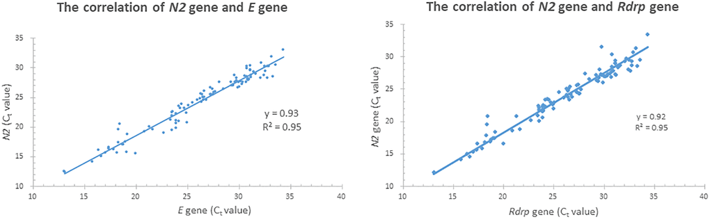 To validate the performance of the multiple PCR assay designed in this study to detect SARS-CoV-2 (N2 gene), all specimens were subjected to rRT-PCR again for the E and Rdrp genes, per the WHO panel. The original samples were confirmed those genes as the reference genes in TSGH. The same specimens were detected by two medical centers: TSGH and CGH using the same protocol on the LabTurbo AIO48 open platform. The Ct value of <35 was defined as a positive result for the pathogen. Each sample had an internal control (Rnase P gene). The external control comprised RNA spike-in mix as the positive control and H2O as the negative control.