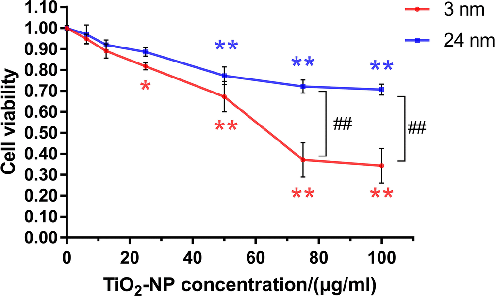 TM-4 cells in 96-well plates were treated with various concentrations (0, 6.25, 12.5, 25, 50, 75 and 100 μg/mL) of TiO2-NPs (3 nm and 24 nm) for 24 h. Then, TM-4 cell viability was determined using the Cell Counting Kit-8 (Beyotime, China). OD450 values were determined using the multiplate reader Multiskan FC (Thermo).