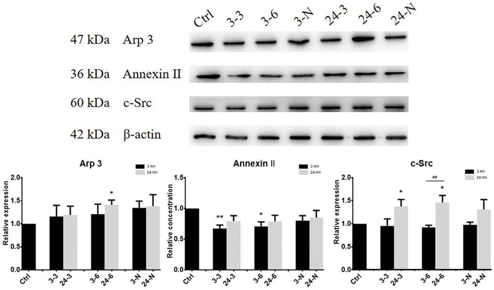 Figure 2. The expression of actin regulatory proteins (Arp 3, Annexin II and c-Src) in TM-4 cells treated with two different concentrations of TiO2-NPs for 24 h. “3–3”: 30 μg/ml, “3–6”: 60 μg/ml, “3-N”: TM-4 cells were treated with 5 mM NAC for 2 h and then treated with 60 μg/ml 3-nm TiO2-NPs for 24 h. “24–3”: 30 μg/ml, “24–6”: 60 μg/ml, “24-N”: TM-4 cells were treated with 5 mM NAC for 2 h and then treated with 60 μg/ml of 24-nm TiO2-NPs for 24 h. n=5, *p<0.05, **p<0.01 compared to the control; ##p<0.01 compared to the NPs.