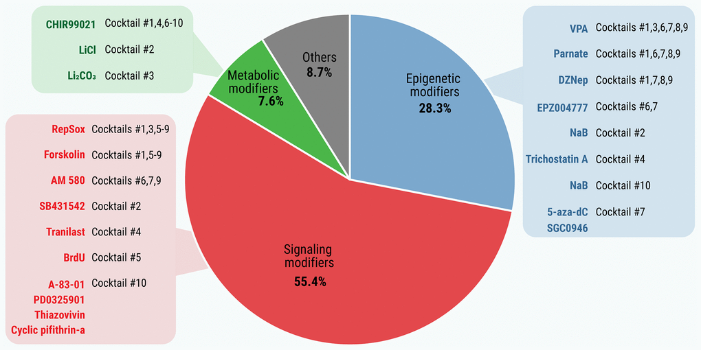 To date, several combinations of SMs have been tested for cell reprogramming activity. Of them, 10 SM cocktails have been established. Their compositions, which vary from three [10] to ten [18] compounds, are presented in Supplementary Table 6. The common denominator for all these cocktails is that they are able to induce cell reprogramming, either full (pluripotent state) or partial (multipotent/progenitor cells), without transfection of stemness-related TFs.