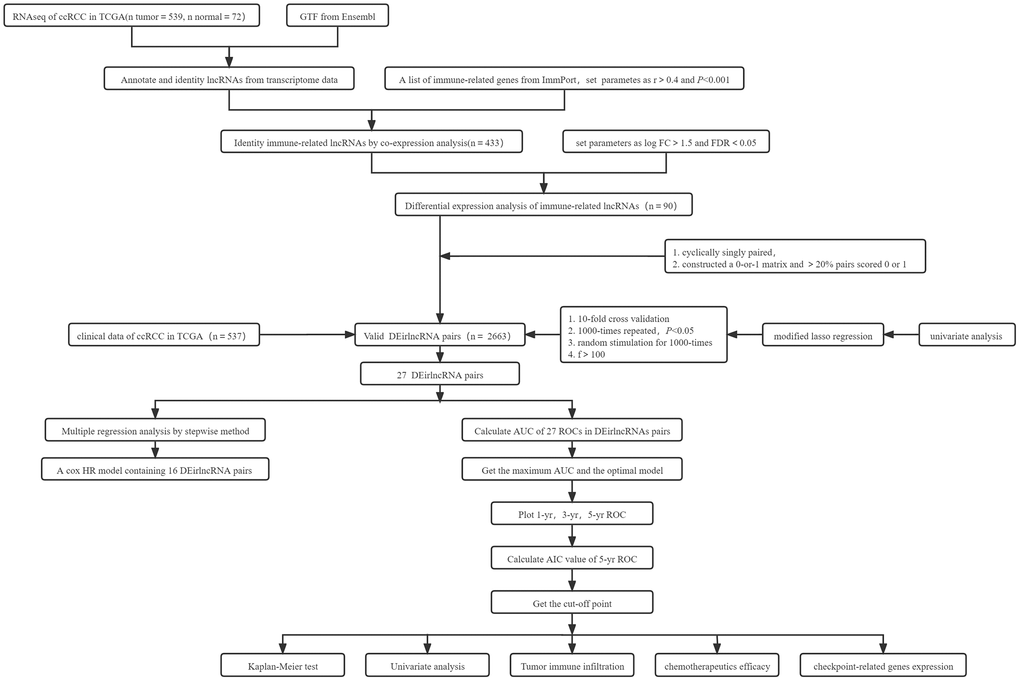 ccRCC: clear cell renal cell carcinoma; TCGA: The Cancer Genome Atlas; ImmPort: The Immunology Database and Analysis Portal; lncRNAs: long noncoding RNAs; GTF: Gene Transfer Format; DEirlncRNAs: Differential Expression immune-related long noncoding RNAs; FDR: false discovery rate; LASSO: Least Absolute Shrinkage and Selector Operation; RS: risk score; ROC: Receiver Operator Characteristic; OS: overall survival; AUC: area under the curve; AIC: Akaike information criterion; MCPcounter: Microenvironment Cell Populations-counter; IC50: half inhibitory concentration; HR: hazard ratio; HR.95L: 95% CI lower limit; HR.95H: 95% CI upper limit; logFC: log fold change.
