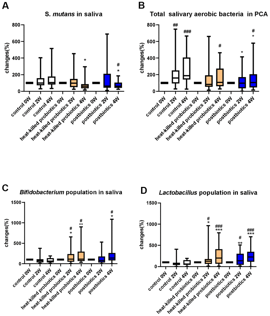 Figure 2. Microbial change (%) in saliva samples. Change (%) in the population of (A) S. mutans, (B) total bacteria, (C) Bifidobacterium, and (D) Lactobacillus in participants’ saliva at 0, 2, and 4 weeks of oral lozenge intake. The oral lozenges contained postbiotics or heat-killed cells. Participants in the control group consumed placebo lozenges without the postbiotic content (*p < 0.05, **p < 0.01, and ***p < 0.001 compared with the control group; #p < 0.05, ##p < 0.01, and ###p < 0.001 in reference to the values at week 0). Data are presented as medians (n = 25 in each group).