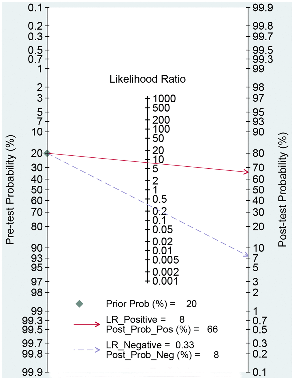 We first performed a threshold effect test, and the Spearman coefficient indicated there was no threshold effect (r = 0.212, P = 0.244). The pooled sensitivity was 0.70 (95% CI: 0.63–0.77, Figure 4), and the specificity was 0.91 (95% CI: 0.88–0.94, Figure 5). The estimated AUC was 0.90 (95% CI: 0.87–0.92, Figure 6). The PLR and NLR were 7.78 (95% CI: 5.7–10.7) and 0.33 (95% CI: 0.26–0.41), respectively. The DOR was 24 (95% CI: 16–37). Figure 7 presents the Fagan plot. If the pre-test probability of one person was 20% for HCC diagnosis, then the post-test probability would be 66%, with a likelihood ratio of 8. If the pre-test probability of one individual was 20%, the post-test probability would be 8%, with a likelihood ratio of 0.33 (Figure 7). Figure 8 presents the scatter matrix. We can see that the scatter was mainly distributed in LRP < 10, and the LRN < 0.1 consisted of few scatters, which means that AFP-L3 tends to be used for exclusion.