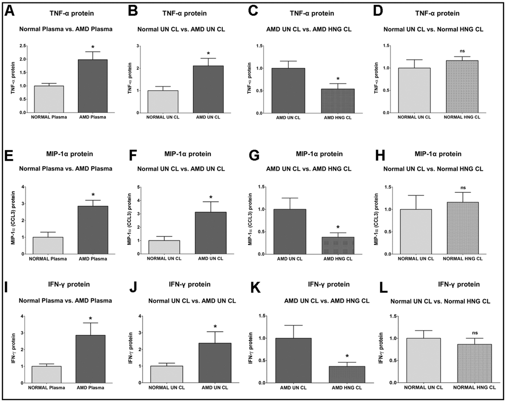 Figure 3. Effect of Humanin G (HNG) on TNF-α, MIP-1α, and IFN-γ proteins. TNF-α protein was elevated in AMD plasma (A) and in AMD RPE cybrid cells (B) compared to their normal counterparts. Treatment with HNG reduced TNF-α protein levels in AMD RPE cybrid ells (C) but not in normal RPE cybrid cells (D), compared to their untreated counterparts. MIP-1α protein was elevated in AMD plasma (E) and in AMD RPE cybrid cells (F) compared to their normal counterparts. Treatment with HNG reduced MIP-1α protein levels in AMD RPE cybrid ells (G) but not in normal RPE cybrid cells (H), compared to their untreated counterparts. IFN-γ protein was elevated in AMD plasma (I) and in AMD RPE cybrid cells (J) compared to their normal counterparts. Treatment with HNG reduced IFN-γ protein levels in AMD RPE cybrid cells (K) but not in normal RPE cybrid cells (L), compared to their untreated counterparts. Data are presented as mean ± SEM. * P<0.05; ns: non-significant.