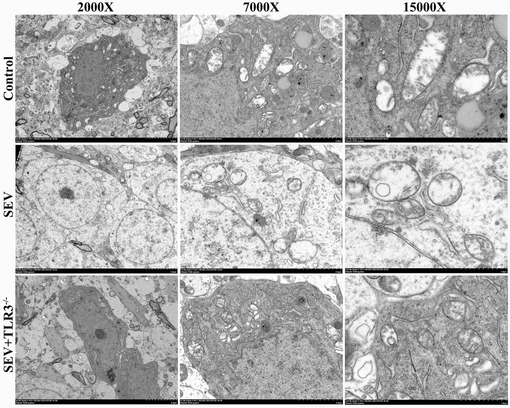 TEM maximumly provided the ability to observe the subcellular organelle in mouse brain tissue. The results showed that in C group, the mitochondria were oval or rod-shaped, surrounded by double membranes, and the inner membrane protruded inward into a flat ridge. The ridge was perpendicular to the long axis of mitochondria, with a large number of mitochondria. Compared with control group, the brain cells in SEV group had a large number of heterotypic mitochondria, which showed vacuolization, swelling, reduced matrix density and broken mitochondrial cristae. The inner and outer membrane defects of some severely damaged mitochondria and the cristae disappeared completely. Although TLR3−/−+SEV group still had a certain degree of injury, the degree of injury was less than that in SEV group (Figure 5).