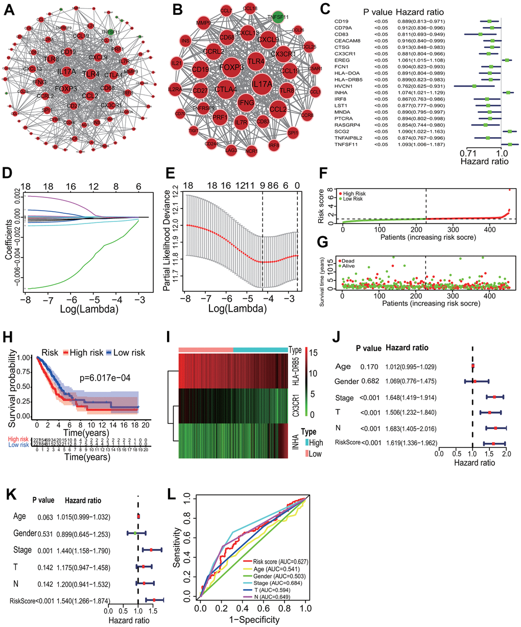 Figure 6. Key immune gene identification and prognostic immune signature construction. (A) PPI network of immune DEGs. An immune PPI network with 79 nodes and 538 edges was established. (B) Highly correlated PPI network. An immune PPI subnetwork with 38 nodes and 372 edges was constructed in the whole immune PPI network. (C) Univariate regression analysis. Twenty immune genes had significantly prognostic values. (D, E) LASSO Cox analysis. Nine immune genes most correlated with the overall survival were identified, and 10-round cross validation was performed to prevent overfitting. (F) Risk score distribution. LUAD patients were divided into the high- and low-risk groups according to the median risk score. (G) Survival overview. The distribution of survival times of LUAD patients in the high- and low-risk groups. (H) Survival curve. A better overall survival of patients in the low-risk group was exhibited than that in the high-risk group. (I) Heatmap of gene expression. HLA-DRB5 and CX3CR1 were highly expressed and INHA was lowly expressed in the high-risk group. (J, K) Independent prognostic analysis. The 3-mRNA risk signature was significantly correlated with the OS of LUAD patients by a univariate and a multivariate Cox regression analysis. (L) ROC curve. The AUC of 3-year survival was 0.627. PPI, protein and protein interaction; LASSO, least absolute shrinkage and selection operator; LUAD, lung adenocarcinoma; ROC, receiver operating characteristic; AUC, area under the curve; OS, overall survival.
