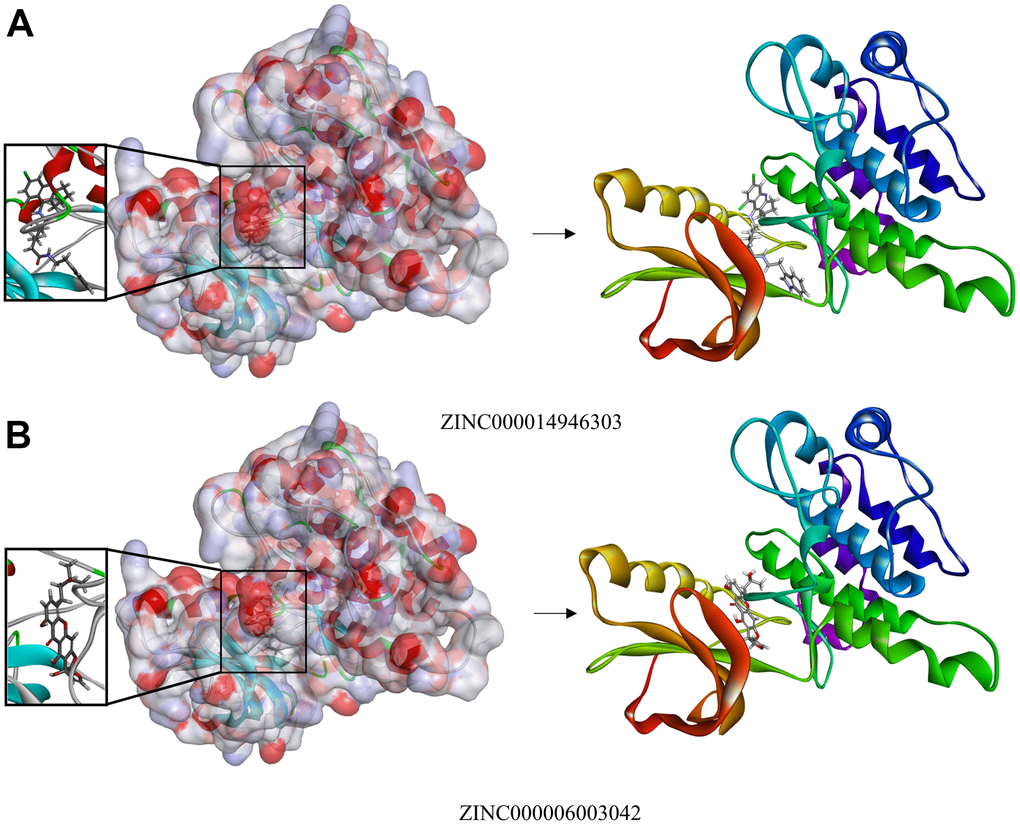 The pharmacological characteristics of candidate compounds are evaluated by ADME and toxicity indicators. ADME provides six computational models for predicting absorption, distribution, metabolism, excretion, and toxicological properties from chemical structure, enabling the prediction of potentially problematic new chemical entities at an early stage of drug discovery. ZINC000014946303 and ZINC000006003042 have good solubility in water. It is beneficial to their absorption and metabolism in the human body and exerts better medicinal effects, so they are selected for follow-up research. In addition, they have no hepatotoxicity and avoid disrupting the normal functioning of the liver. Compared with other compounds, they have less rodent carcinogenicity, Ames mutagenicity, potential characteristics of developmental toxicity, and higher safety. The reference drug ZINC38433168 also has no hepatotoxicity, with less rodent carcinogenicity and Ames mutagenicity. It is also predicted to be a non-CYP2D6 inhibitor with weak absorbability in plasma protein binding properties. Therefore, ZINC000014946303 and ZINC000006003042 are considered to be safe drug candidates. On the other hand, although the remaining drugs have certain toxicity or side effects, they may still promote drug development. Considering all results, ZINC000014946303 and ZINC000006003042 are suitable to be ideal compounds and further investigation.