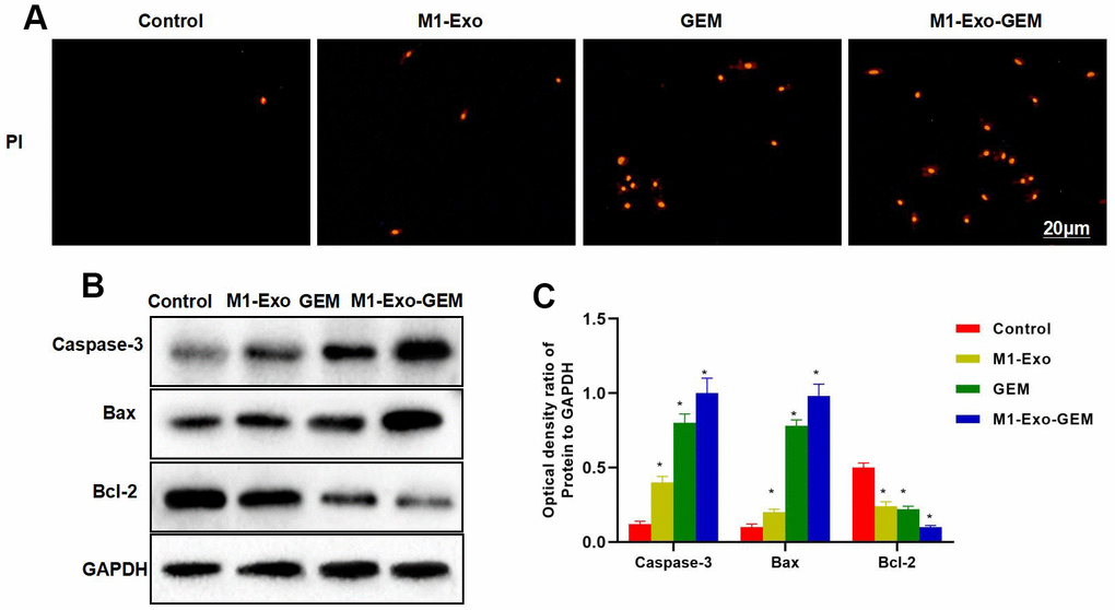 Figure 4. Effect of M1-Exo-GEM on MB49 apoptosis. (A) In PI staining, M1-Exo and GEM could promote apoptosis, as manifested by significantly higher number of positive cells than that of Control group, while M1-Exo-GEM could further promote apoptosis. (B, C) According to protein assay results, Bcl-2 was highly expressed in the Control group, while Caspase-3 and Bax were lowly expressed. GEM and M1-Exo enhanced the expressions of Caspase-3 and Bax and inhibited the Bcl-2 expression, suggesting their pro-apoptosis effect. M1-Exo-GEM could further promote the apoptosis signal activation. *P<0.05 vs. Control group.