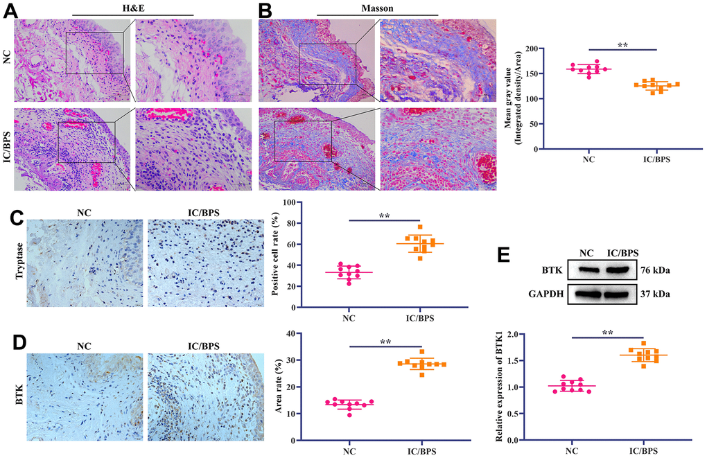 Figure 4. Differential expression of BTK in IC/BPS clinical samples. (A) HE staining shows the pathological state of IC/BPS samples. Scale bar: 100 and 50 μm. (B) Masson staining is used to distinguish collagen fibers from muscle fibers. Collagen fibers are blue and smooth muscle fibers are red. The staining results show that compared with NC group, collagen fibers in IC/BPS group are significantly reduced. Scale bar: 100 and 50 μm. (C, D) IHC staining showed the difference of (C) Tryptase and (D) BTK expression in normal and IC/BPS tissues. Scale bar: 20 μm. (E) Western blotting exhibited the expression level of BTK in normal and IC/BPS tissues. In all cases, Values are mean ± SD (n=10 for each group; *P<0.05, **P<0.01).